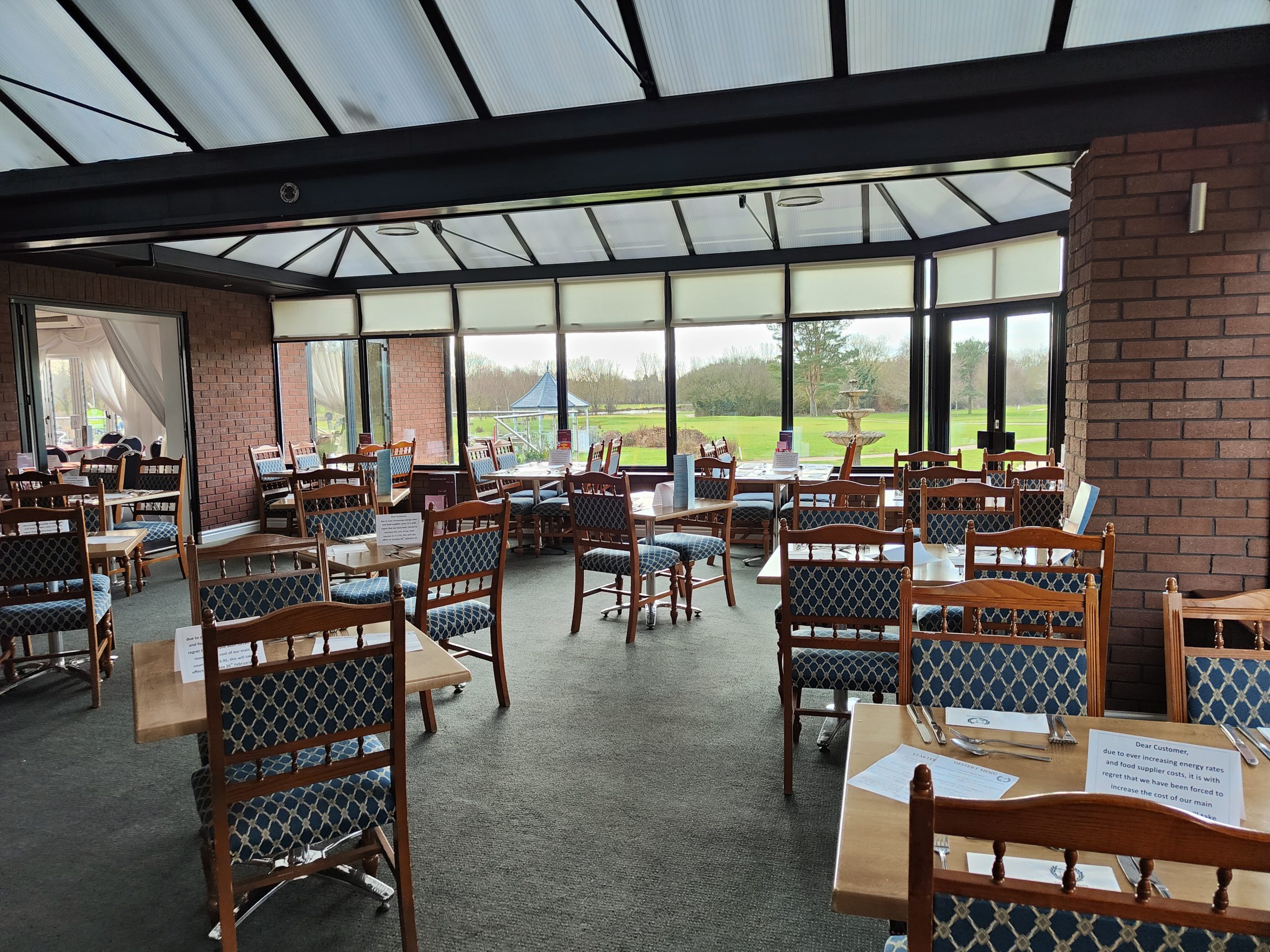The indoor marquee with its pure white drapes and crystal fixings creates the dream atmosphere for Weddings, events and celebrations. With Bose surround sound and mood lighting throughout there are few venues in the area that can compete. The french windows open onto the seated patio overlooking the golf course and elegant setting to enjoy the British summer.