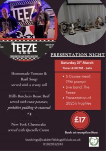 Three-Course Meal, Presentation of Trophies and live music from “The Teeze”