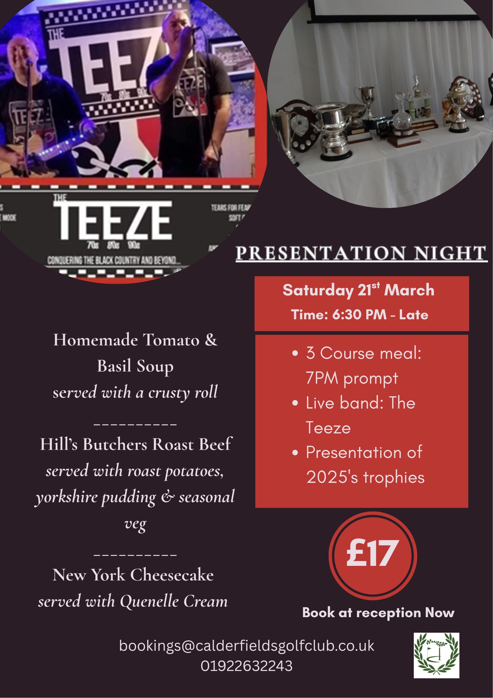 Booking is essential and that’s really easy just contact our reception desk to obtain your tickets or call us on 01922 63 22 43 or E-mail bookings@calderfieldsgolfclub.co.uk