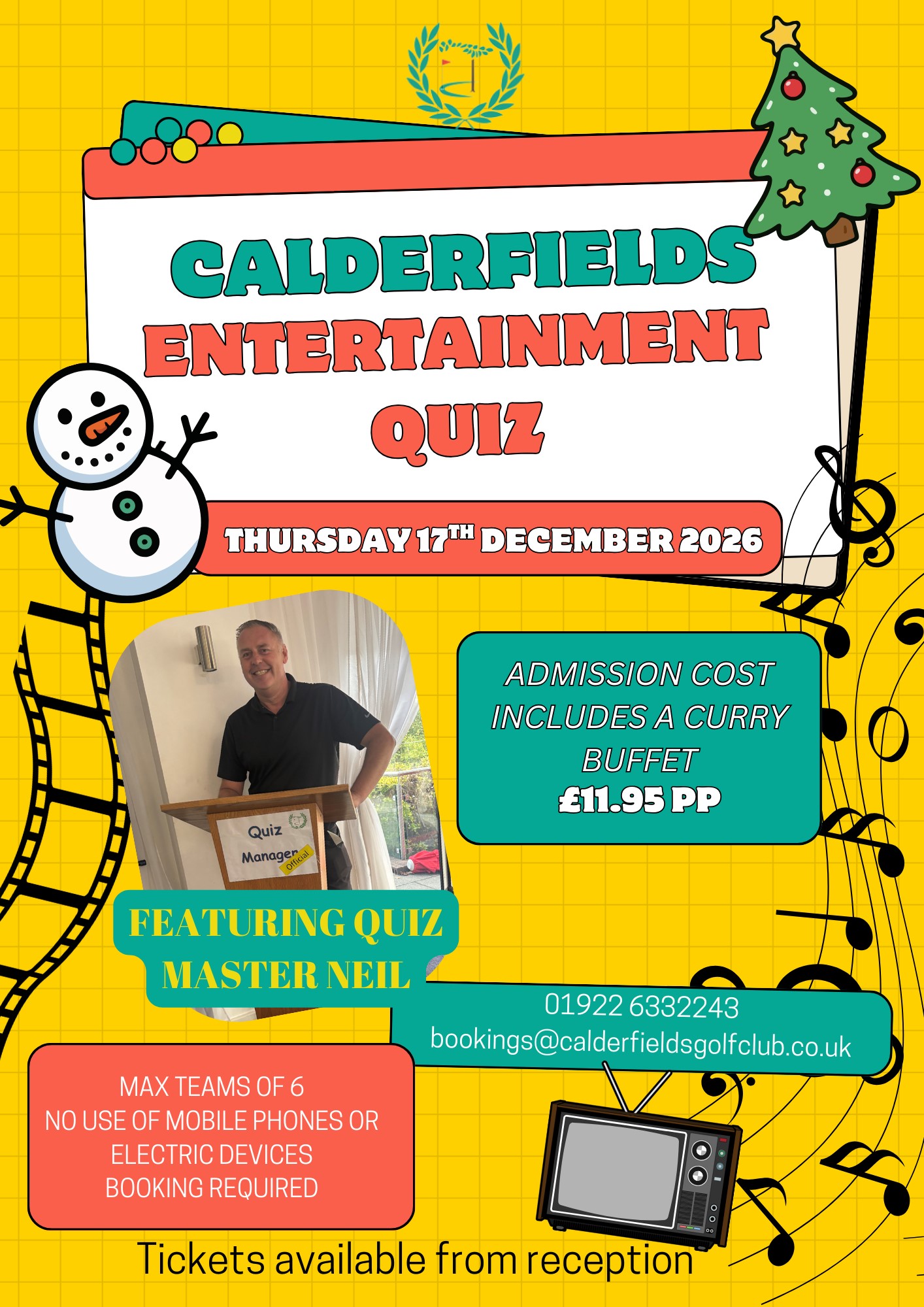 To book your place just call us on 01922 63 22 43 or E-mail bookings@calderfieldsgolfclub.co.uk